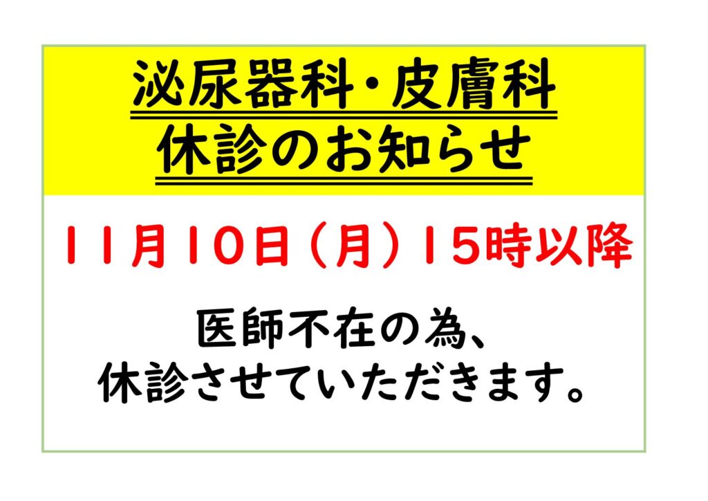 泌尿器科・皮膚科臨時休診のお知らせ 11月10日 15時以降休診